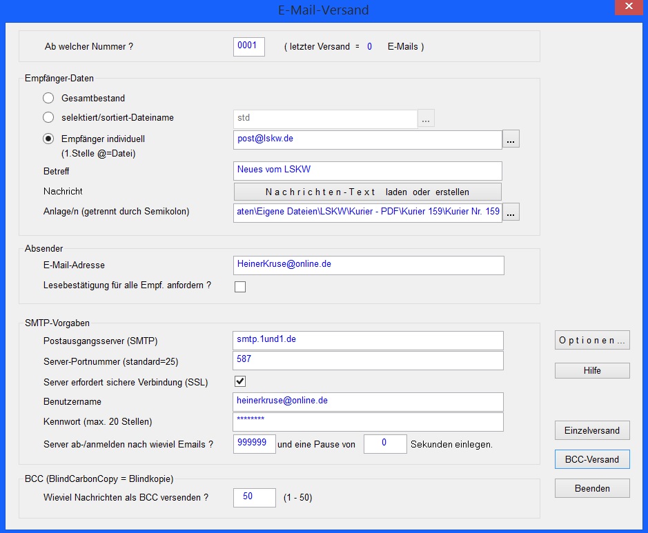 Egal ob ich BCC-Versand oder Einzelversand wähle, ich bekomme immer die Fehlermeldung: " Verbindung nicht möglich !"