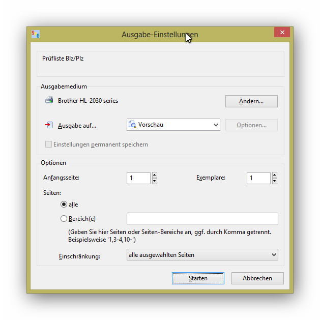1.Ausgabe-Einstellung der Prüfliste- hier ist "Vorschau" voreingestellt. Soll die Liste gedruckt werfden, muß bei "Ausgabe auf.." auf Drucker umgestellt werden.