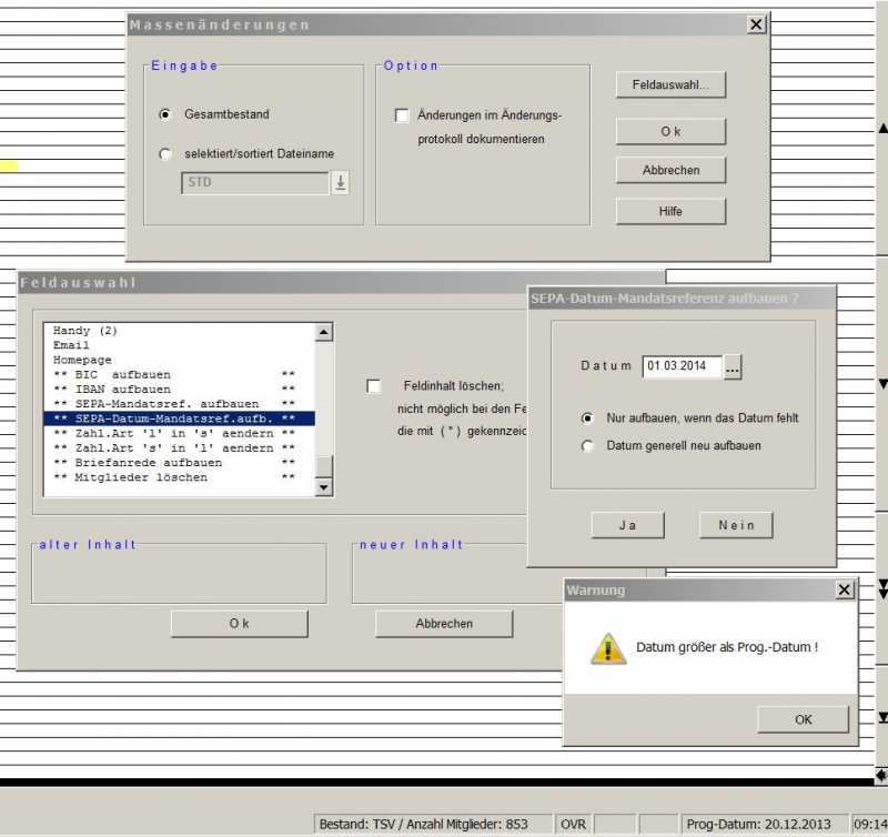 Datum größer als Programmdatum. Was soll das ? Ich will doch den Termin des SEPA Abbuchungsverfahrens auf den Termin 1.3.2014 festlegen und kann doch nicht warten, bis mein Programmdatum (siehe unten rechts) in 3 Monaten auf dem Termin steht.