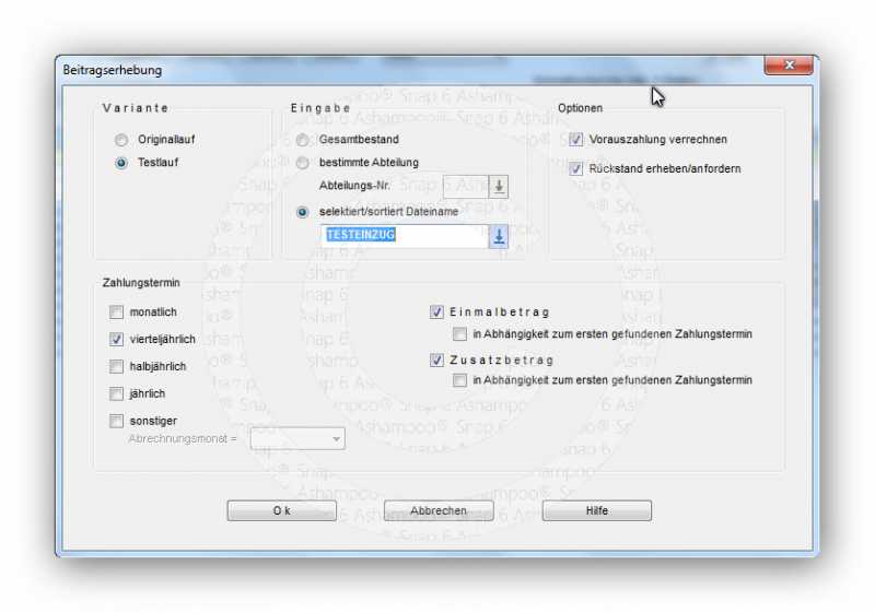 Diese habe ich heute erfasst mit der Aufnahmegebühr im Feld Einmalbeitrag1, in einer Liste selektiert und für diese Liste eine Beitragserhebung (Testlauf) durchgeführt.
