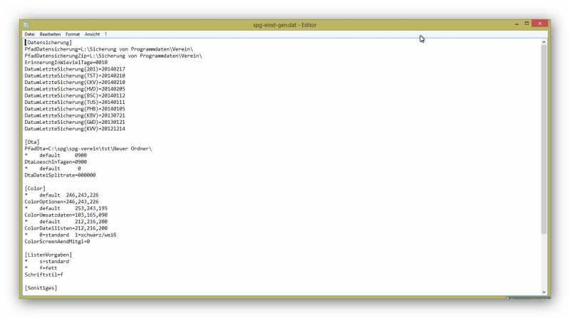 Sehen Sie doch mal in der Datei "spg-einst-gen.dat" nach, was dort steht. Diese finden Sie im Verzeichnis "spg/spg-verein/spg-files". Ein Screenshut füge ich bei.