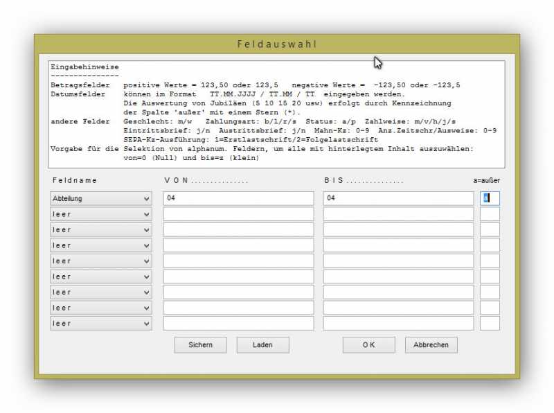 Die Selektion basiert zwar auf Abteilung, aber in der Ergebnisliste ist dann das Mitglied komplett nicht mehr enthalten. Bzw. wenn es enthalten ist, dann mit beiden Abteilungen. Eine getrennte Abrechnung der beiden Abteilungen eines Mitglieds auf Basis einer Selektion ist eigentlich nicht möglich oder?