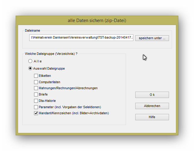 grundsätzlich werden bei der Option "Alle" alle Verzeichnisse in die Zip-Datei aufgenommen, haben Sie bei "Auswahl Dateigruppe" eine Auswahl vorgenommen, werden natürlich nur die ausgewählten Verzeichnisse in die Zip-Datei aufgenommen.