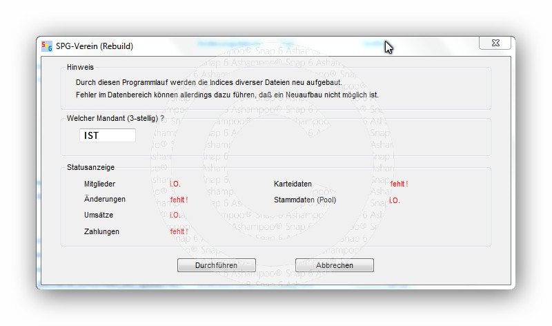 Ich habe den Verein "IST" angelegt, ohne die Stammdaten auszufüllen, danach wurde das Programm geschlossen. Das Rebuild dazu in der Anlage. Bei Ihnen fehlen die "Pool-Daten".
