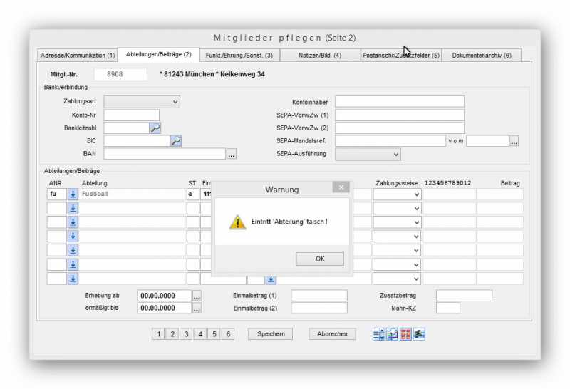 Das Feld "Eintrittsdatum" unter "Abteilung/Beiträge" nimmt mehrere Zeichen an sind sie nicht "150315" oder "15.03.2015" kommt der Fehlerhinweis (siehe Anhang), da dies ein nummerisches Feld ist.