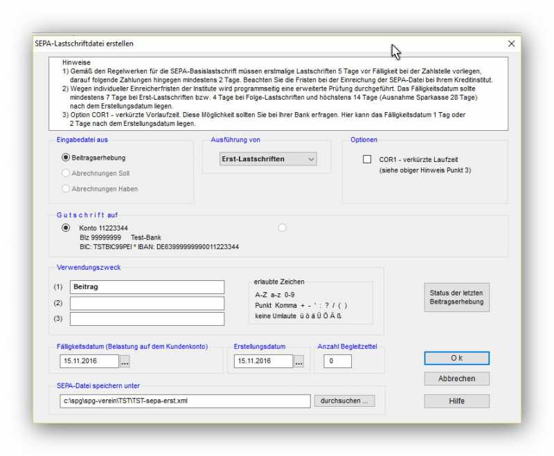 Bei der Beitragserhebung wird bei der Erstellung der SEPA-Lastschriftdatei keine Zip-Datei erstellt, sondern eine XML-Datei, auch diese finden Sie in dem Verzeichnis, das Sie in der letzten Zeile des Anhangs 2 sehen.