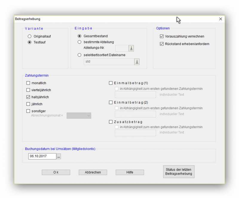 4. Wie sieht Ihre Beitragserhebung aus?? Haben Sie vor einen Testlauf gemacht, um die Richtigkeit der Beitragserhebung zu prüfen??? Sind die Optionen richtig gesetzt.?? (siehe Anhang)