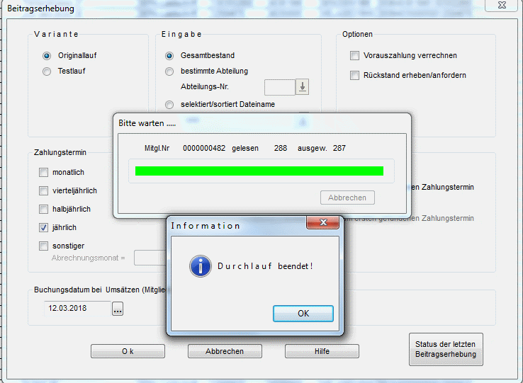 Wenn ich einen Durchlauf zur Beitragserhebung mache, werden 288 Mitglieder gelesen, aber nur 287 ausgewertet (Sreenshot angehangen).