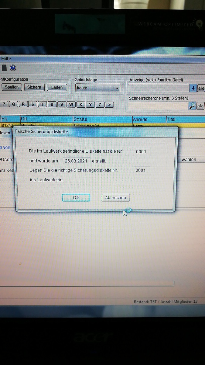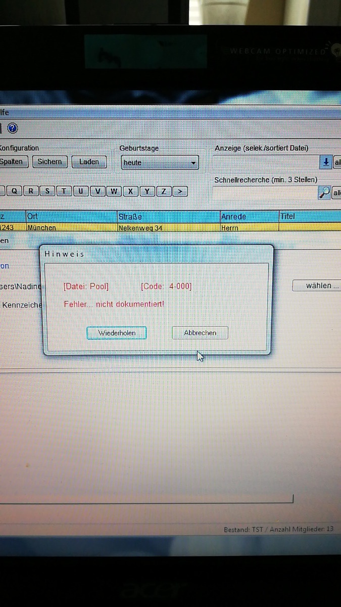 wir haben vor kurzem einen Wechsel bei der Mitgliederverwaltung gehabt. Nachdem wir das System auf dem Rechner der neuen Zuständigen installiert haben, wollten wir den Datenbestand hochladen. Dabei haben wir folgende Fehlermeldung erhalten.