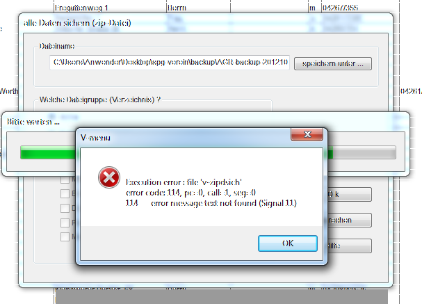 da ich keine Administratorenrechte auf meinem PC besitze, habe ich das Speicherverzeichnis in das öffentlich zugängliche Verzeichnis abgelegt, hier C:\Users\Anwender\v2000-w\AGR. Ich habe jetzt, Ihren Anweisungen folgend das Verzeichnis nach C:\Users\Anwender\Desktop\spg-verein\backup verlegt, dabei trat dann folgender Fehler weiterhin auf: Execution error : file 'v-zipdsich' error code: 114,pc=0,call=1,seg=0,114 error messasge text not found (Signal 11).