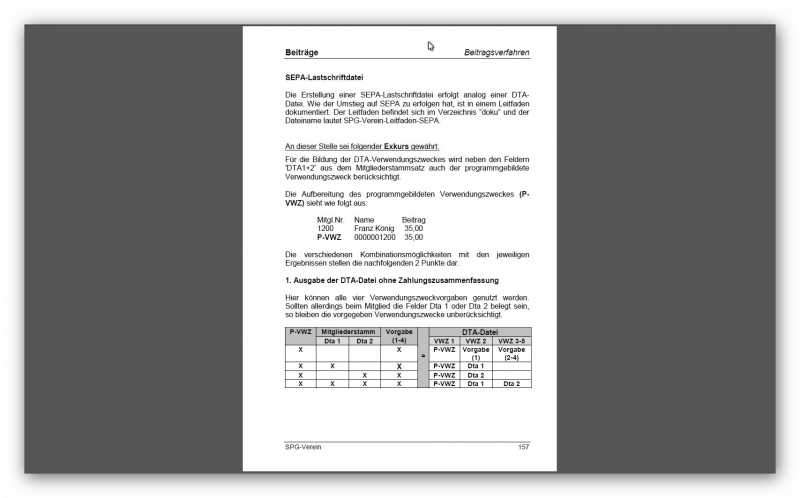 Ich meinte die Liste, die ich über "Beiträge - Beitragsverwaltung - DTA-Verwaltung" und dann in dem neuen Fenster über die DTA-Liste der richtigen Datei erhalte. Hier steht ja quasi genau das gleiche drin wie in der Datei, nur nochmal schön dargestellt. Hier steht für jedes Mitglied ein Betreff für den Einzug OHNE die Mandatsreferenz. Weitere Ideen?