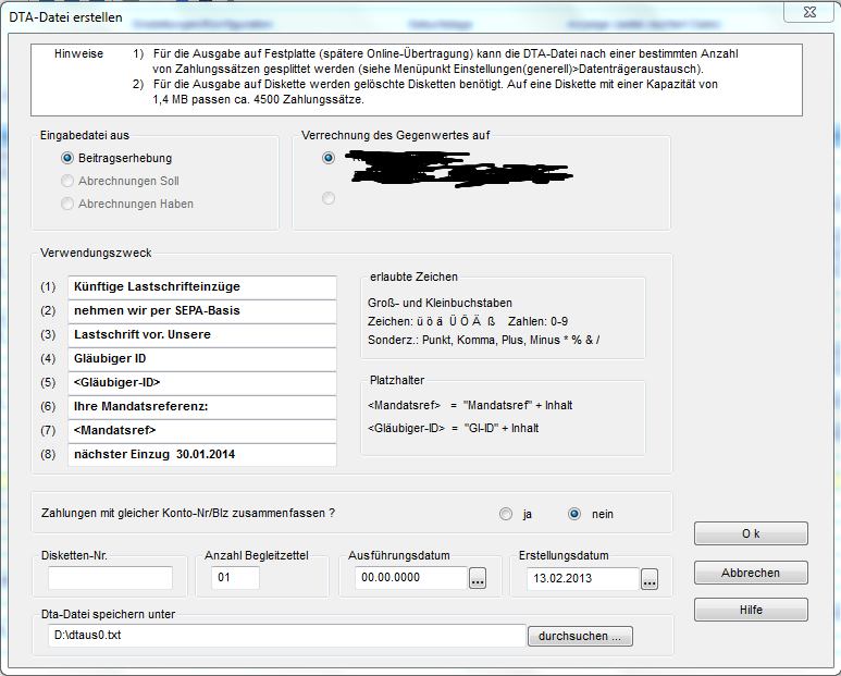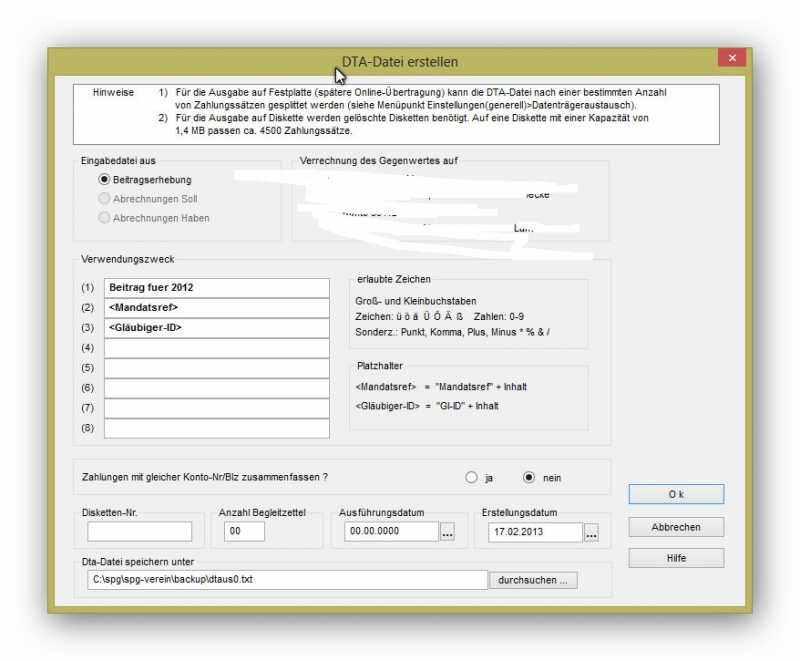also ich gehe auf "Beiträge - Beitragsverfahren - DTA/SEPA-Datei erstellen". Dann wähle ich bei "Welche Datei soll erstellt werden" die DTA Datei aus. Es öffnet sich das Fenster "DTA-Datei erstellen"Dort habe ich 8 Zeilen für den Betreff, das stimmt. Hier habe ich auch die Platzhalter eingetragen. Dies ist doch der generelle Verwendungszweck, richtig?