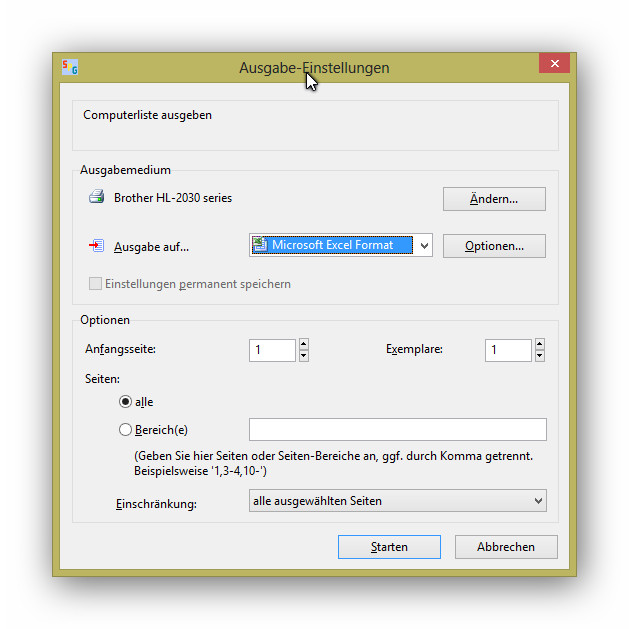 Es lässt sich jede Liste als EXCEL-datei ausgeben. In den Ausgabeeinstellungen (siehe Screenshut) läßt sich dies einstellen.