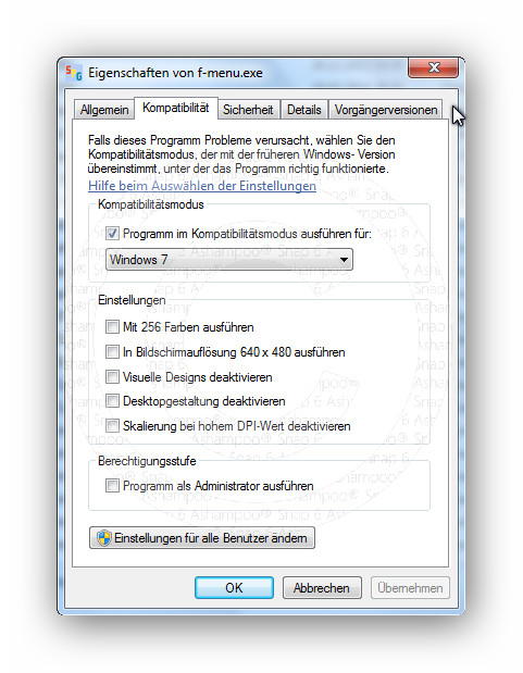 ich habe die Datei f-menu.exe gefunden und entsprechend Ihren Anweisungen die Kompatibilität auf Windows 7 geändert...