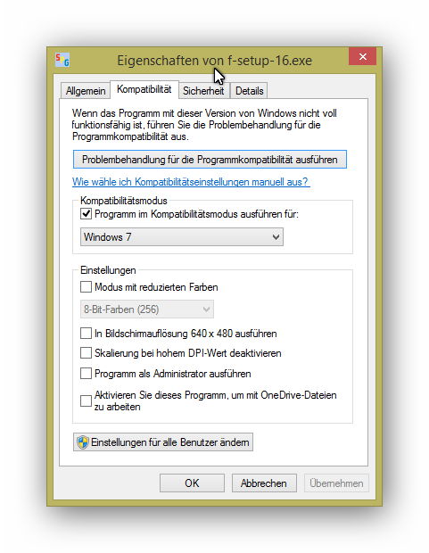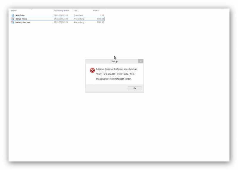 haben Sie die "f-Setup-16.exe" mit der rechten Maustaste und der "Behandlung von Kompatibilitätsprobleme" behandelt??