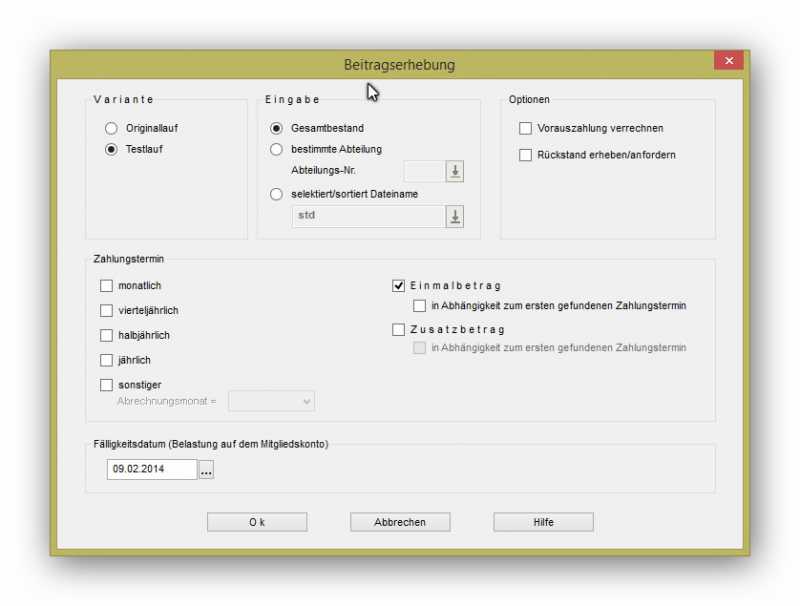 Bei der Beitragserhebung wird jetzt nicht der "Gesamtbestand" sondern der selektierte Bestand "einmalbetrag" ausgewählt. Die Einstellung bleibt wie in Anlage 1.