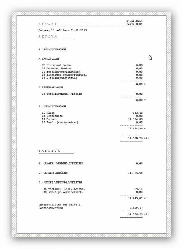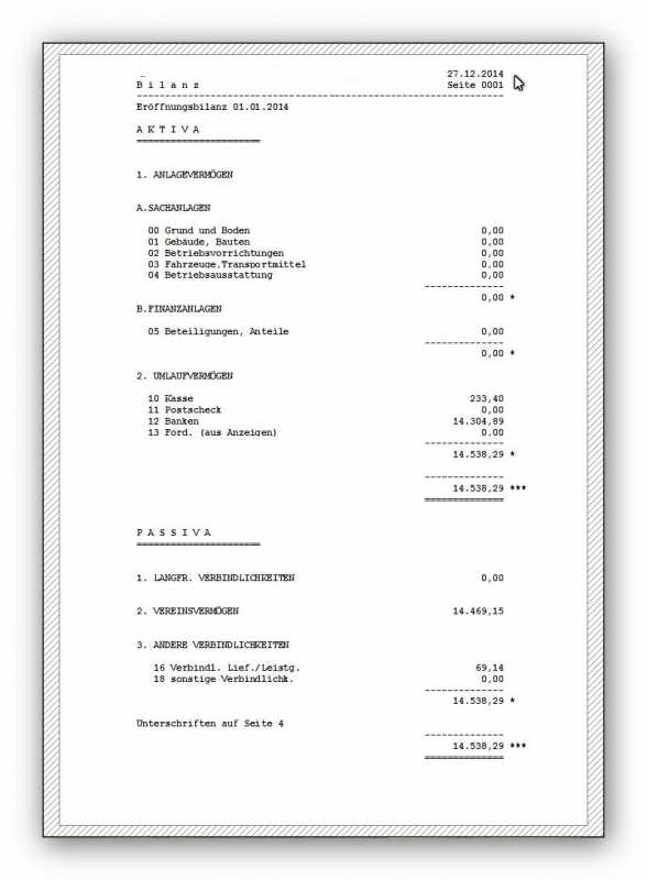 Die Aktiva und Passiva beinhaltet die Bestandskonten des Vereins z.B. Kasse, Bank für Aktiva und mindestens Vereinsvermögen für Passiva. Die Endsummen beider Arten müssen übereinstimmen.