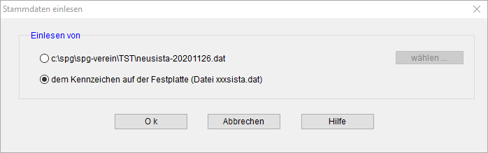 Starten Sie nun SPG-Verein und öffnen den neuen Mandanten. Klicken Sie dann auf "Extras" > "Datensicherung" > "Stammdaten einlesen" und wählen die Option "dem Kennzeichen auf der Festplatte"