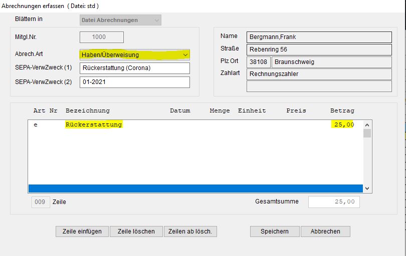 Dieser Screenshot zeigt, wie eine solche Abrechnung für ein Mitglied erfasst werden kann: