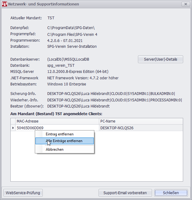 - im Fenster "Netzwerk-Information" alle Datensätze (MAC-Adresse) über das Kontextmenü (Rechtsklick) löschen.