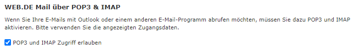 Achtung: Neuerdings muss in den Web.de Einstellungen erst erlaubt werden, dass POP3, IMAP und SMTP Zugriffe erlaubt sind: