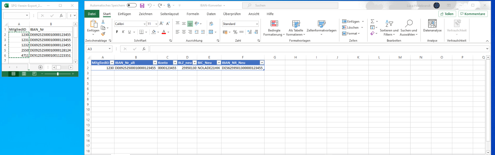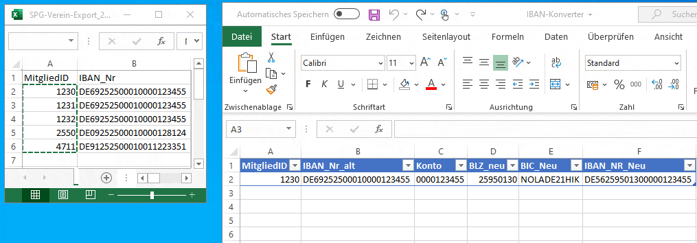 Öffnen Sie die Export-Datei und den IBAN-Konverter mit Excel.