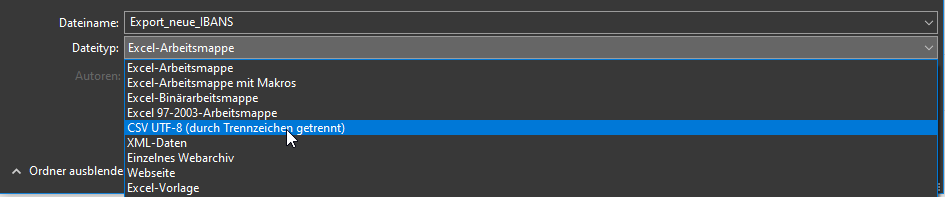 Anschließend speichern Sie die Datei über "Datei" > "Speichern unter" und wählen den Dateityp "CSV UTF-8 (durch Trennzeichen getrennt) aus.