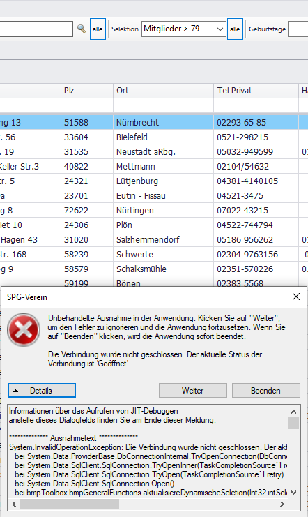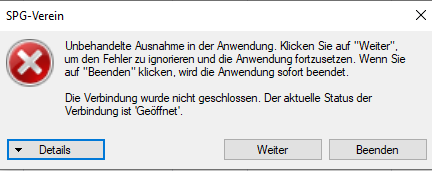 mal abgesehen davon, daß SPG4 nach meiner Ansicht zu langsam startet, bzw. das Öffnen der Mitgliederübersicht nach Auswahl des Mandanten 76 Sekunden dauert, erhalte ich bei der Selektion unten angefügte Fehlermeldung.