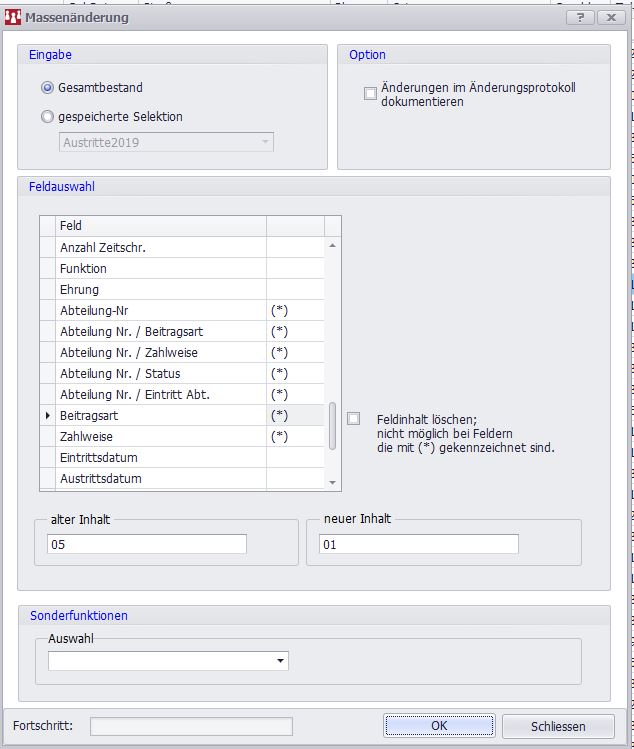 ich wollte eine Massenänderung vornehmen und zwar die Beitragsart 05 nach Beitragsart 01. Das Programm zeigt keine Reaktion.