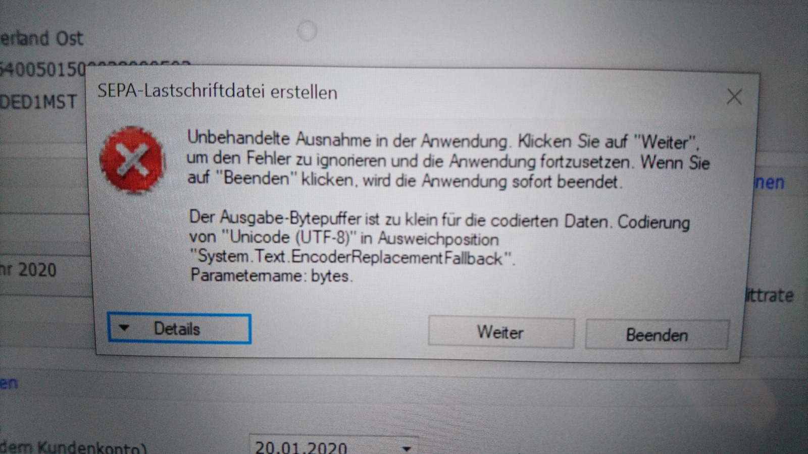 beim Erstellen der SEPA Datei bekomme ich die unten angefügte Fehlermeldung. Programm und auch Windows sind auf dem neuesten Stand.