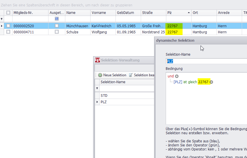SPG-Verein 4 überprüft nicht, ob der Straßenname zur PLZ passt. Nach Eingabe der PLZ wird lediglich im bestehenden Mitgliederbestand gesucht, ob die PLZ bereits bekannt verwendet wurde und übernimmt den Ortsnamen. Sollte es hier zu einem fehlerhaften Ergebnis kommen, müssen Sie dieses Mitglied finden und den Ortsnamen korrigieren. Dazu bietet sich eine Selektion an: