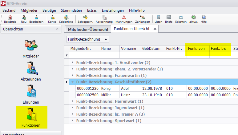 Bsp: Ein Mitglied wird Vorsitzender des Vereins. In dessen Karteikarte trage ich bei Funktion "Vorsitzender" ein. Nach ein paar Jahren lässt er sich nicht wieder wählen, bleibt aber als "normales Mitglied" im Verein. Ich ändere die Funktion bzw. lösche sie aus seiner Kartei. Wird jetzt irgendwo in der Kartei für die Zukunft gespeichert: Vorsitzender von bis? Oder muss ich das manuell dann als Notiz eintragen, wobie es ja eigentlich keine Notiz sondern eine Funktion ist/war. Und ich könnte über dne Notizeintrag nicht mal alle Vorsitzenden für z. Bsp. eine Chronik filtern.