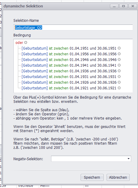 Dafür verwende ich die beigefügte Selektion, das funktioniert problemlos. Nun das Problem: Zunächst habe ich die Seleketion vom Vorjahr verwendet und lediglich alle Geburtsjahe um ein Jahr erhöht und abgespeichert. Bei dem nun folgenden Suchlauf hätten eigentlich nun die aktuellen "runden" Geburtstage erscheinen sollen, es waren aber auch noch die vom Vorjahr dabei, die jetzt aber 66, 71 usw. Jaher alt sind. Dieses Problem konnte ich nur beheben, indem ich die Selektion gelöscht habe und neu angelegt habe. Mein Eindruck ist, dass intern eventuell entsprechend Felder nicht richtig initialisert werden ...