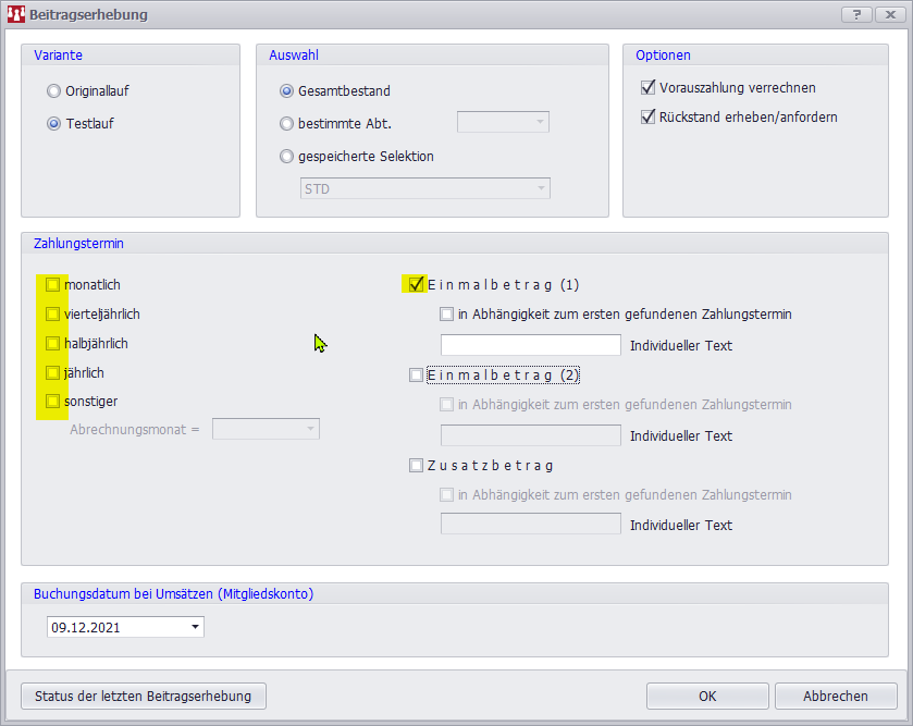 ich habe in den einzelnen Mitgliedsmasken unter Einmalbetrag (1) jeweils Beträge gespeichert, die ich jetzt per SEPA LS abbuchen will.