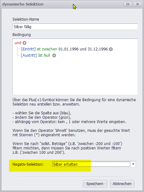 Das Problem: Bei Anwendung des Filters wird trotzdem immer ein Mitglied mit einer Silberehrung mit ausgegeben. Bei dem Mitglied habe ich die Ehrenmitgliedschaft noch einmal eingegeben, aus dies hilft nicht.