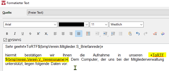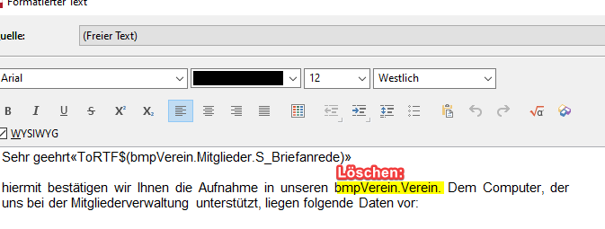 Ich bin Anfänger in Sacher Briefe. Möchte ich den Musterbrief "eintritt.brf" nutzen, wird unser Vereinsname nicht angezeigt: