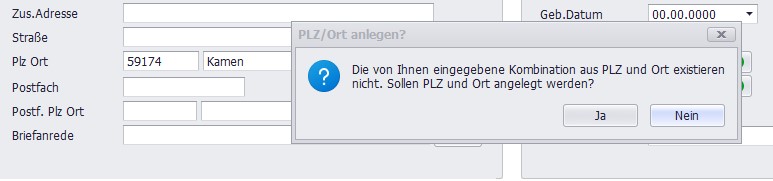 Wird aber eine Kombination von PLZ und Ort eingegeben die die Liste nicht kennt, poppt ein Fenster auf mit der Meldung, daß beide unbekannt sind und ob sie in die