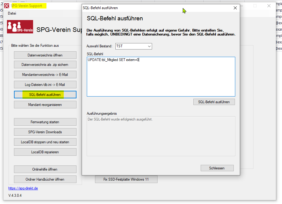 Ich habe das eben mit der 4.3.0.5 nochmal getestet. Kein Mitglied war EXTERN. Änderungen über das SPG-Verein-Support Tool, aber vorher ein Backup erstellen: