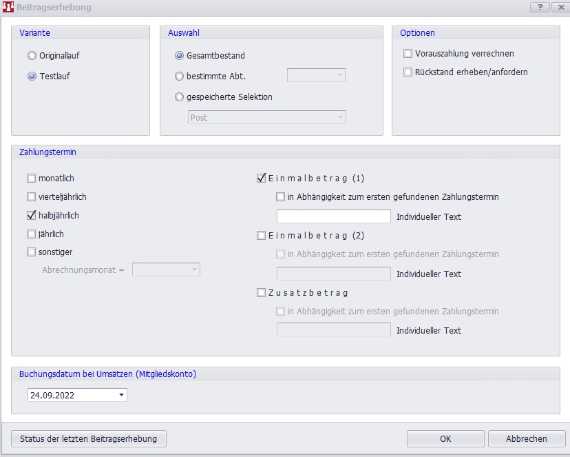 Gehen Sie auf "Einstellungen-Bestand"; Sie erhalten das Bild "Einstellungen (Bestand) - "Allgemeines/Beitragserhebung" hier klicken Sie Ihre Wünsche an, schon läuft alles.