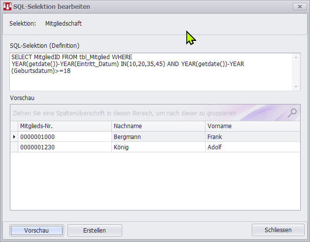 in der SQL-Anweisung scheint sich ein Fehler eingeschlichen zu haben. Ein Mitglied ist 1974 geboren und 1978 eingetreten. Für die Berechnung wird das Jahr 1992(1974+18) herangezogen. Bei der Selektion wird dieses Mitglied im Jahr 2023 mit 45 Jahren Mitgliedschaft angezeigt ??? Wo könnte der Fehler liegen?