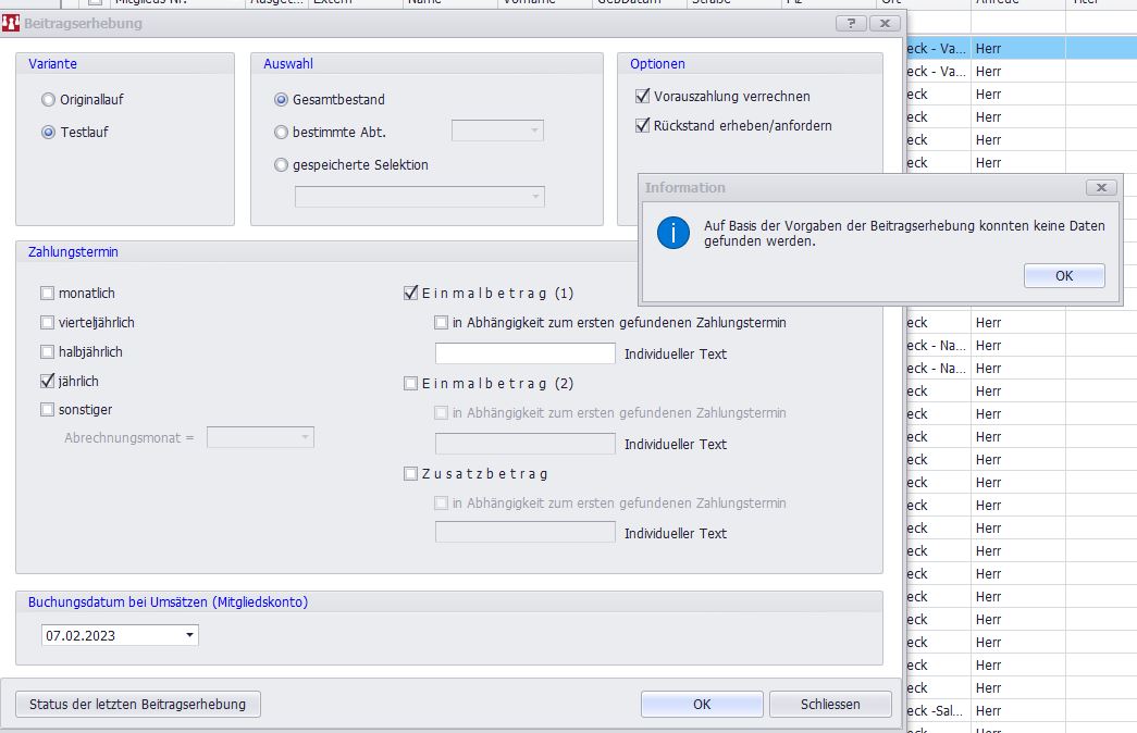 habe gleich die nächste Frage und zwar zum Beitragseinzug. Jetzt im Feb. sollen die fälligen Jahresbeiträge eingezogen werden. Einstellungen siehe Fotos.