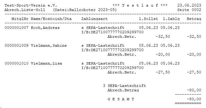 Beispiel: Herr Müller hat noch 50,00 € offene Beiträge. In diesem Fall bekommt er per SEPA 75,00 € für seine Übungsleitertätigkeiten überwiesen und der Kontosaldo bleibt bei -50,00 €. Die Zahlungen tauchen nicht in der Umsatzliste auf.