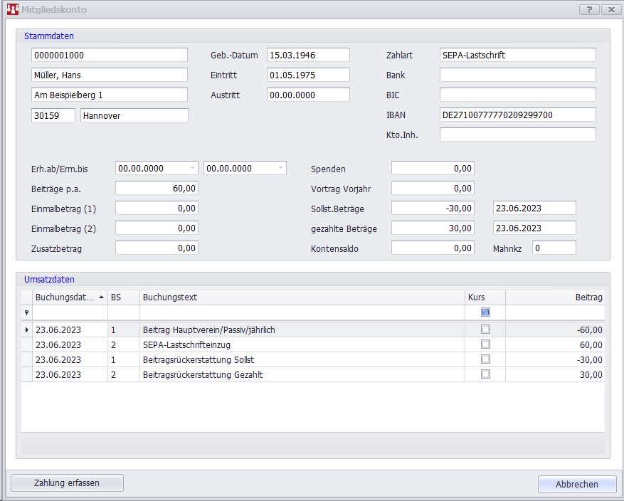 Beispiel: Ein Mitglied hat den Jahresbeitrag von 60,00 € bereits geleistet. Tritt das Mitglied bereits in der 1. Jahreshälfte aus, sollen laut Satzung der Beitrag der 2. Jahreshälfte erstattet werden.