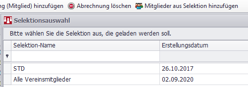 Menü Mitglieder/ Selektionen/Sortieren - Selektionen verwalten - Neue Selektion
