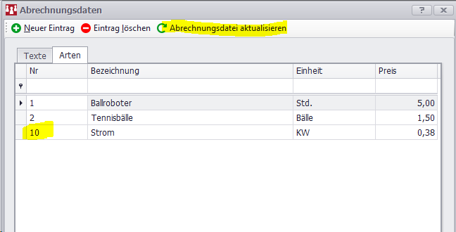 In diesem Menü können sowohl Abrechnungstexte (erklärende Textzeilen für die Abrechnung) als auch Abrechnungsarten (vorgegebene Abrechnungszeilen) hinterlegt werden.
