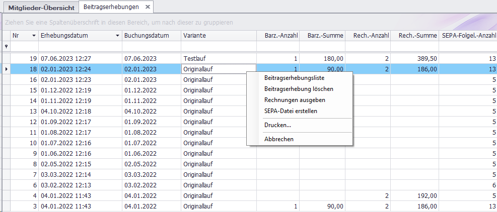 Sie bekommen die durchgeführten Beitragserhebungen angezeigt.