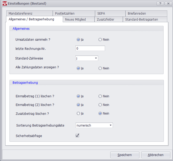 Hier kann bestimmt werden, ob die Beitragserhebungsliste sortiert nach "alphabetisch" (Nachname) oder "numerisch" (Mitglieds-Nr.) angezeigt werden soll.