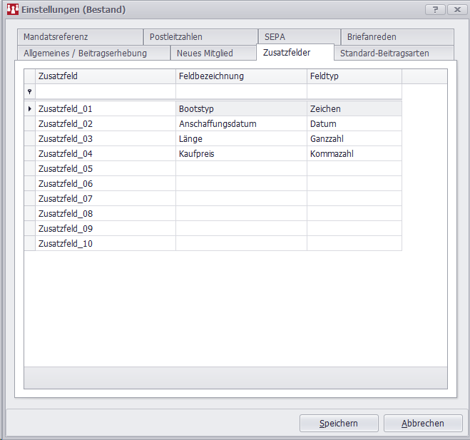 Es besteht die Möglichkeit, Zusatzfelder vorzugeben, die beim Mitglied auf der 5. Registerkarte dargestellt werden.
