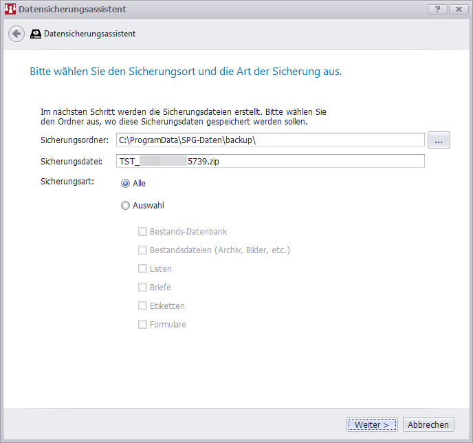 Im Fenster für „Datenbestand sichern“ haben Sie mehrere Optionen:
