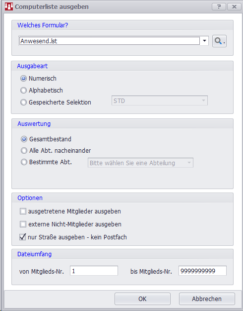 Nach Aufruf der Funktion Liste ausgeben werden als erstes Listenauswahl (Dateiname) und Dateiumfang erfragt. Außerdem sind Ausgabeart und Auswertung zu definieren. Über die Optionen kann festgelegt werden, ob auch ausgetretene Mitglieder berücksichtigt werden sollen.